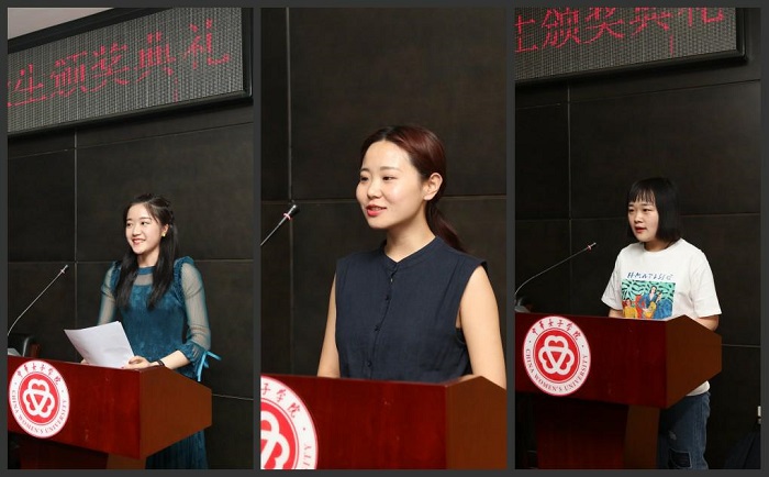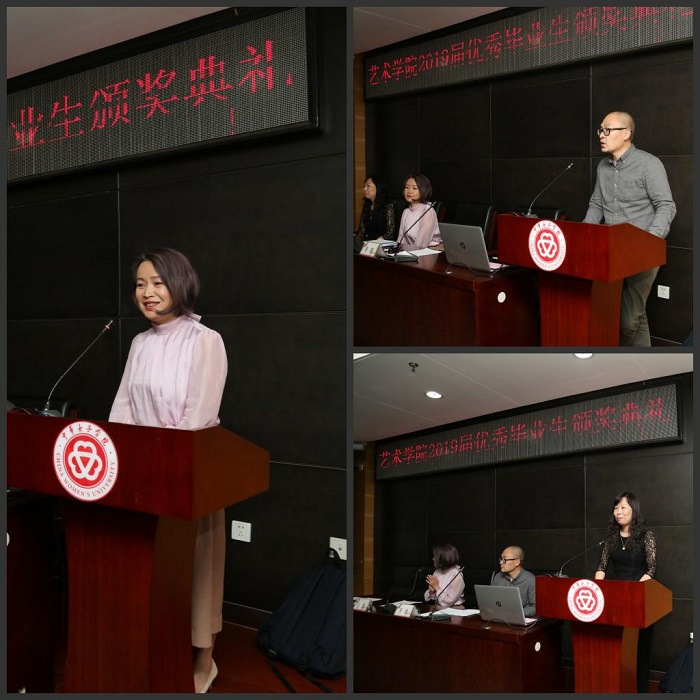 院长王露教授代表艺术学院致辞,向所有获奖的同学表示衷心的祝贺,希望同学们在今后的艺术道路上不断突破自我,在各自的专业领域里取得更大的成绩!来自服装专业的于季琦、来自环境专业的姜兰和来自视觉姜格三名学生分别代表毕业生发言,表达了对老师的感恩之情和对学校的恋恋不舍!艺术学院副书记刘洪玉老师宣读了2019届毕业生优秀获奖作品名单,对获奖同学表示祝贺也对全体毕业生提出期许和祝福,希望她们打响人生中的第二场战役—就业。