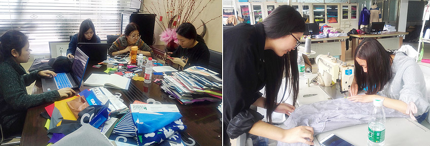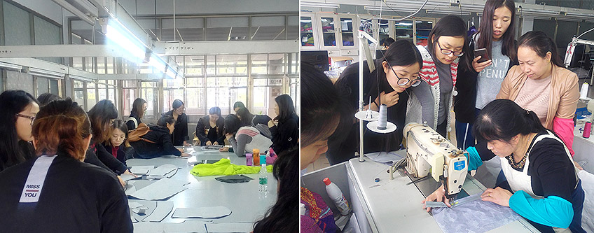 近五天的实习日程安排非常紧凑充实。学生们与工厂职工一起吃住一同上班,全方位参观了服装工厂的各个车间和科室,观摩了流水线服装生产的制作流程和现代化管理模式,并且观察收集了户外运动装的特殊面辅料的应用,以及特殊工艺要求下的服装机械的用法。不仅如此,在短短的实习中,学生们还进行了实际上机操作,以小组的形式协作完成了运动装样衣的制作。通过亲身制作体验,进一步夯实学生内容。样衣制作时,学生们边学边做,遇到不会的地方就及时到流水线去向有经验的职工请教取经,技术科的工人姐姐也非常乐意地来示范解惑。