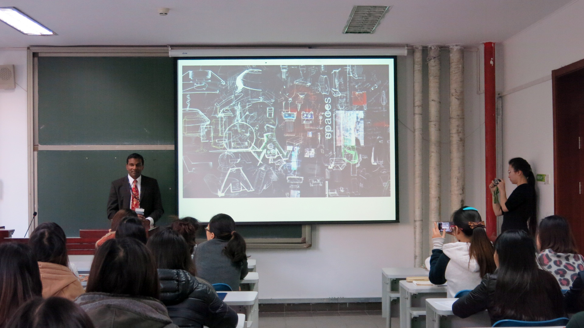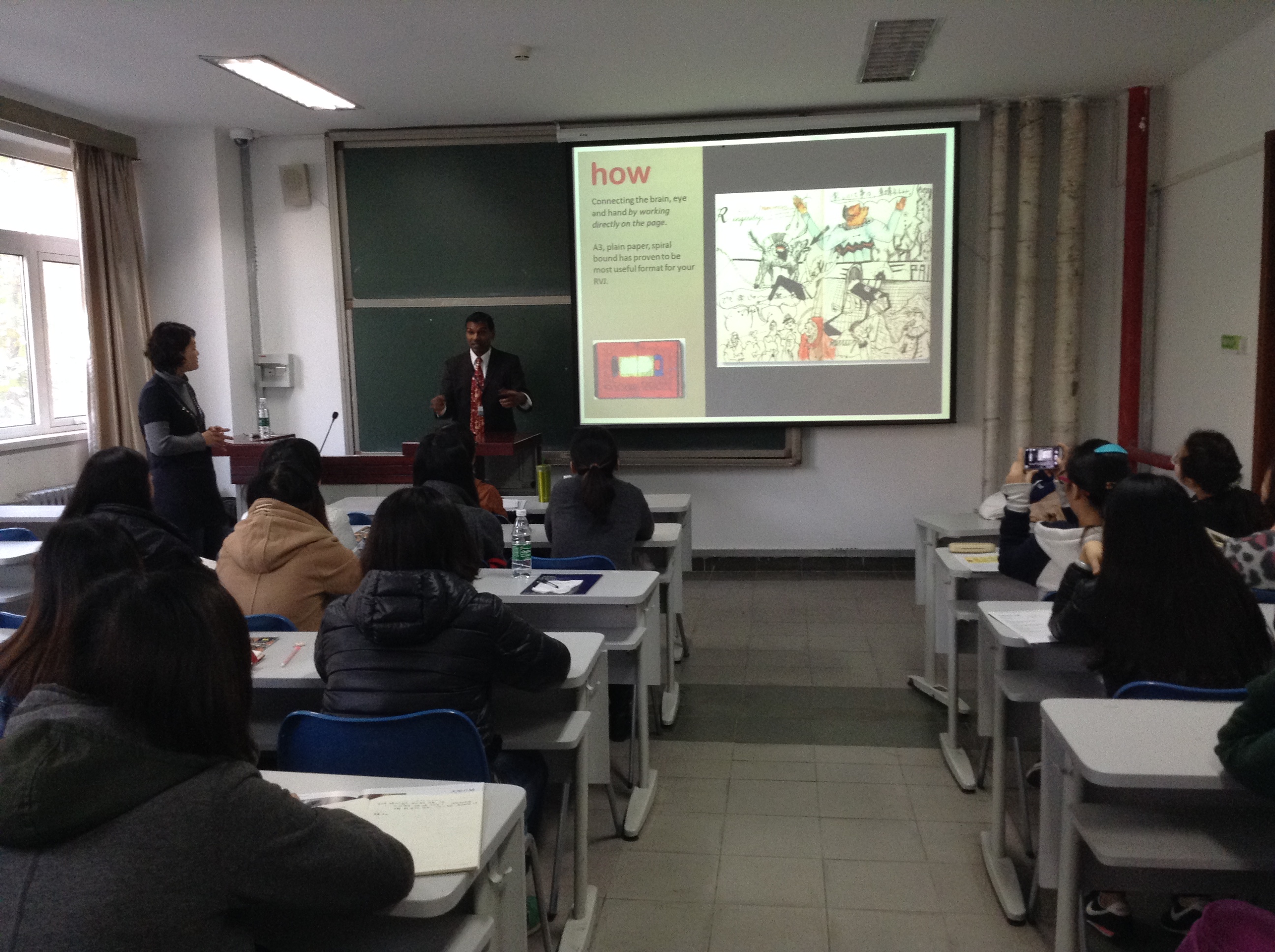 上午Panch博士向艺术学院师生做了题为“调查视觉日记”讲座。对英国的教学方式与英国学生设计创作的过程进行了分析讲解,指出调查视觉日记(RVJ )对于创作过程的重要性,是记录设计过程的重要依据。指出学生在设计创作过程中应该注意三个重点:创造力、挑战与对使用者的影响。并且通过图文结合的方式向同学们展示了英国学生的创作过程。Panch博士还回答了同学们申请英国大学的流程,并且提出了宝贵建议。讲座后,Panch教授与同学们进行了互动交流。