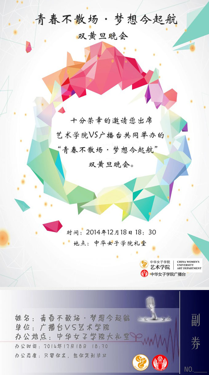 艺术学院VS广播台携手举办的“青春不散场 梦想今起航”双黄旦晚会将于12月18日晚18:30在学校礼堂隆重登场,诚挚的邀请各位老师和同学莅临现场,和我们一起狂欢吧!