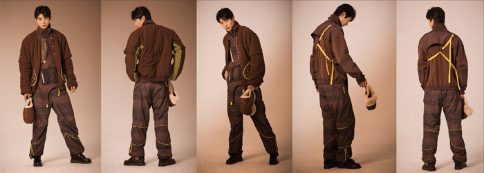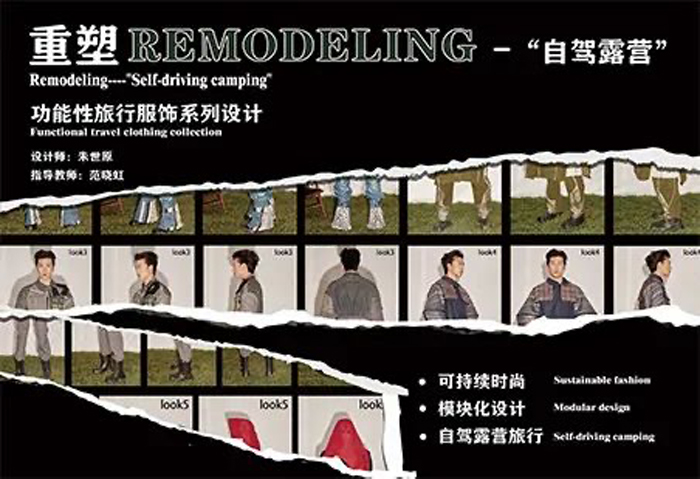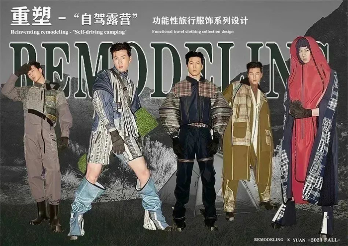 设计说明:近年来,世界的运行方式暴露出许多缺陷,人们越来越意识到环境保护的迫切性和积极情绪的必要性。系列设计以东方修复工艺金缮为主要灵感来源,秉持将地球放在首位的理念,采用消费者愈发青睐的回收设计,通过二手回收,将旧物升级重造,聚焦模块化设计,实现全天候的多场景着装需求。以现代化设计打造复古自驾露营风格的功能性服装,迎合都市青年的潮流生活方式,传递更乐观的生活状态和更积极的可持续理念。