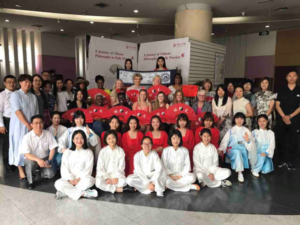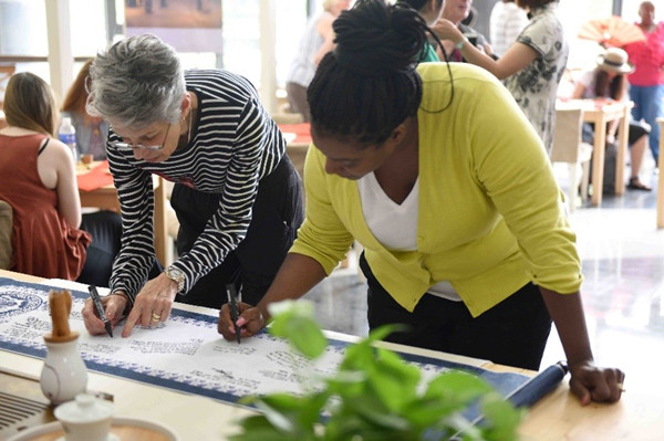 自由交流过程中,外宾或体验古筝演奏,或继续完成中文名字的毛笔撰写,或了解茶道中每一种茶具的用途,或继续交流如何在在日常生活中习练太极……充分的交流让外宾们近距离的感受着浓浓的中国文化内涵。
