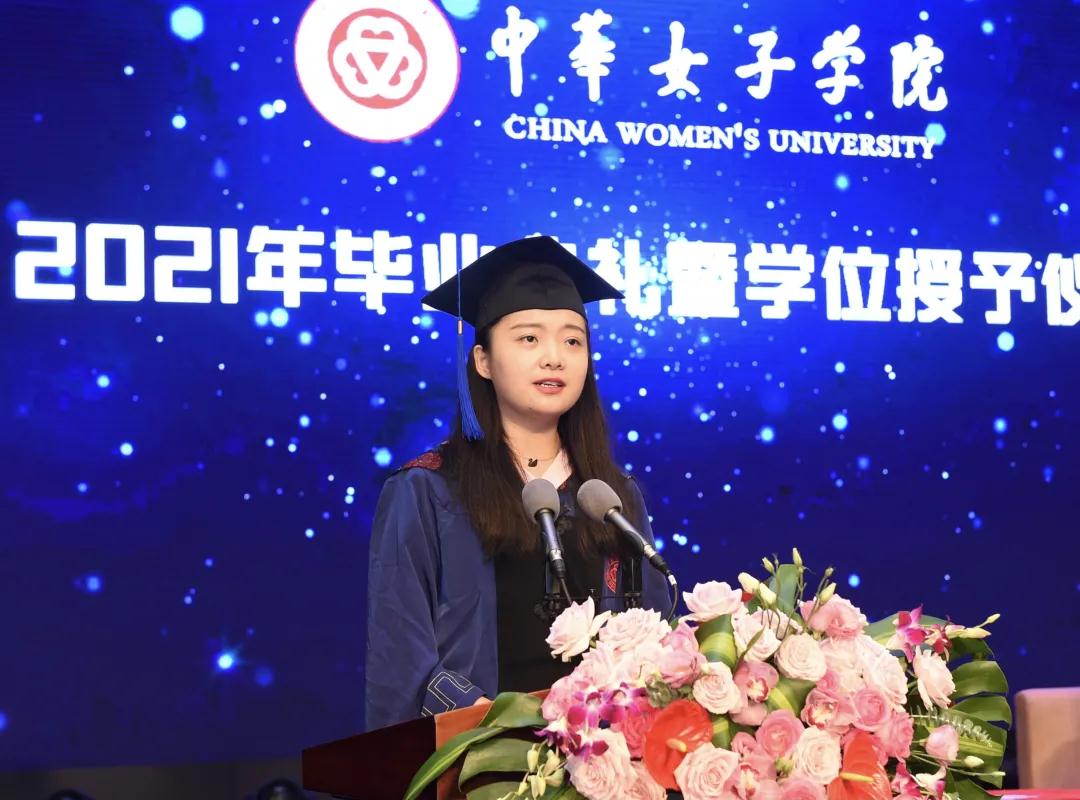 在“我要上典礼”活动中脱颖而出的法学院法学专业李忆漩作为本科毕业生代表发言。她介绍了自己的入伍经历,并从秉持自尊自信自立自强的“四自”精神,传承女院忠于理想的家国情怀,展示中国女性力量与自信的角度出发,讲述了退役复学后参加国庆70周年阅兵训练的体会。毕业后,她义无反顾的选择走入基层,通过接触社会、了解社会,并代表毕业生表示不会辜负母校的培育,定将绽放中国女性的卓越风采。