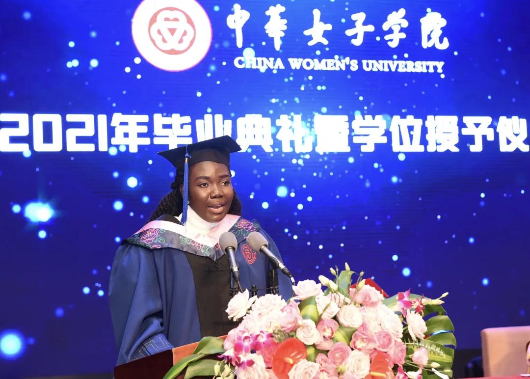 来自加纳的援外学历学位硕士研究生国际学员代表普林西斯发言。她代表援外班毕业生感谢中国政府、商务部奖学金秘书处、全国妇联和bwin必赢中国官网,感谢在新冠肺炎疫情期间给予同学们另一个家,做同学们的坚强后盾。特别是女院在疫情期间的付出、爱和关怀令同学们难忘,也教会同学们鼓起勇气,面对困难和挑战。感谢学校指明的人生道路,培养并激励女性,为她们赋权。作为从bwin必赢中国官网毕业的女性领导者,毕业后与学校,与校友之间的联系将永存下去。当回到各自的国家,她们将成为知识的传播者、友好的见证者。