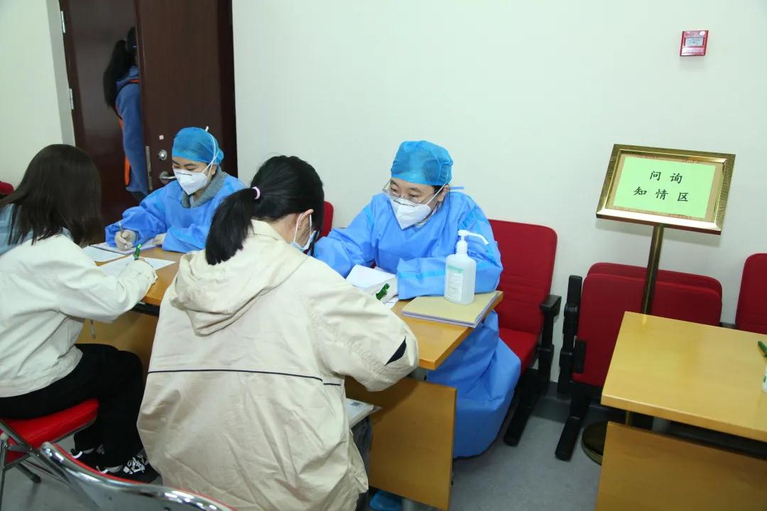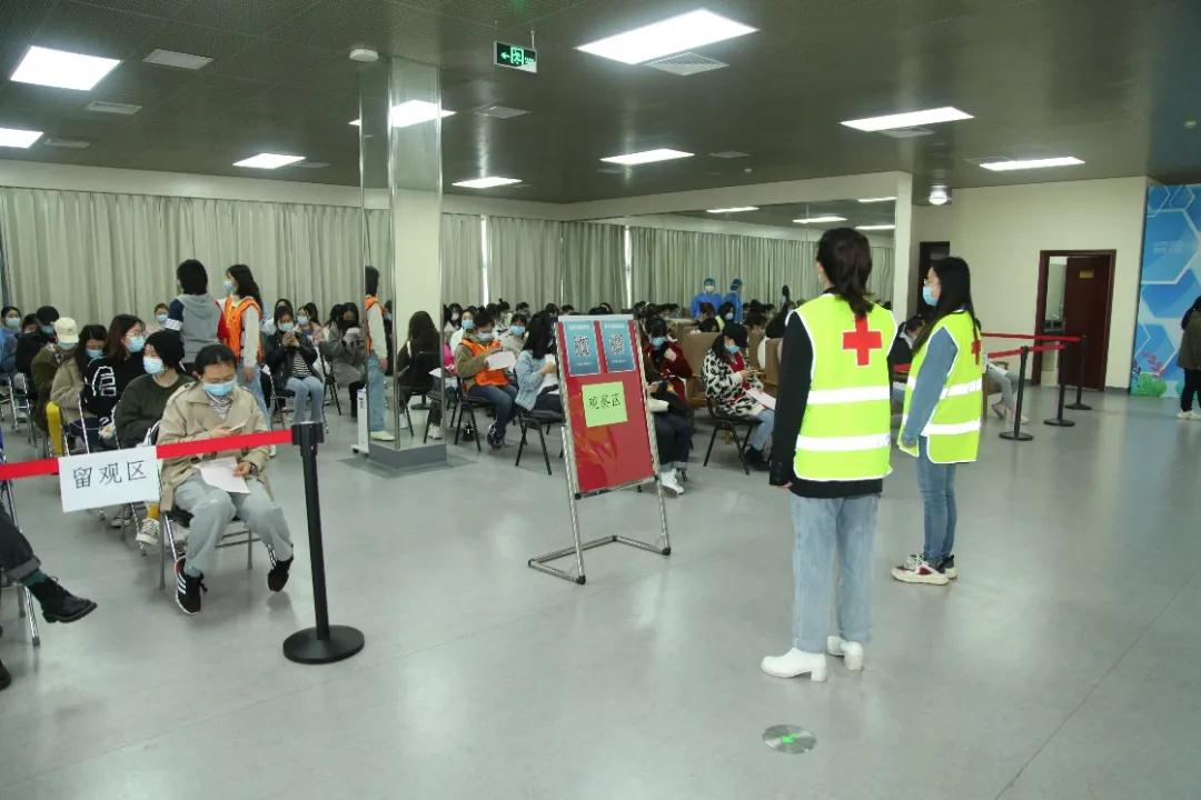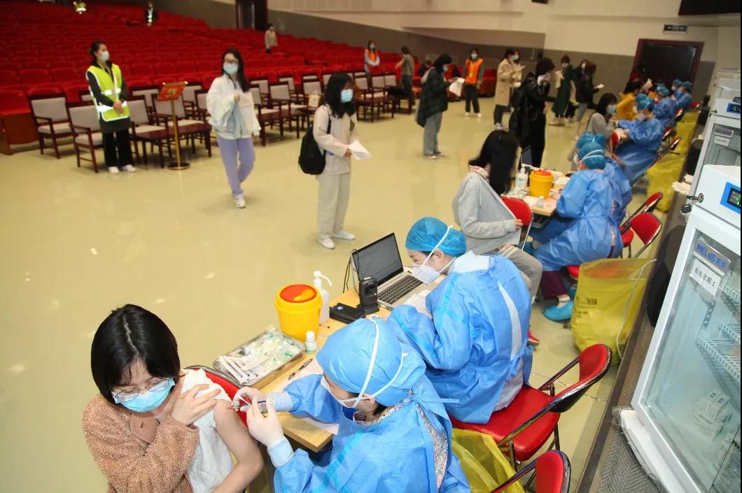 整个接种过程中,学校相关部门工作人员和50余名学生志愿者共同组成现场保障团队,负责人员引导、秩序维护、信息登记、现场服务等工作。为及时妥善处置疫苗接种后的不良反应,学校还设置了应急处置区和心理疏导专岗。