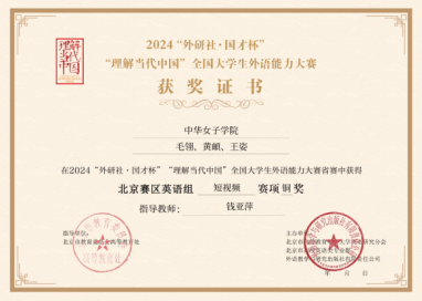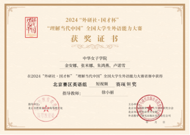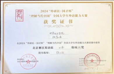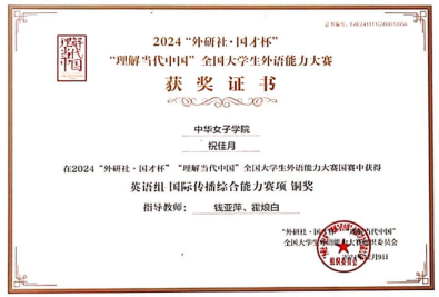 2024年12月9日,2024“外研社·国才杯”“理解当代中国”全国大学生外语能力大赛国赛在北京落幕。必赢官网派出18名选手参赛,经过激烈角逐,国际教育学院钱亚萍老师指导的播音与主持艺术专业本科生祝佳月和会计学专业本科生胡家缘喜创佳绩,分获英语组国际传播综合能力赛项国赛铜奖、演讲赛项北京市金银奖,其他同学获北京市铜奖,国际教育学院英语教学团队的7名教师获“优秀指导教师”荣誉。