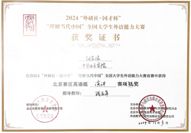 英语组演讲北京赛区决赛 | 胡家缘 | 北京市银奖 | 会计学 | 2023 | 本科生 | 钱亚萍 |