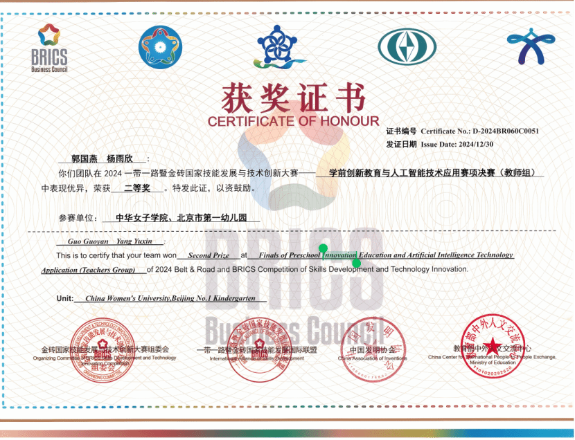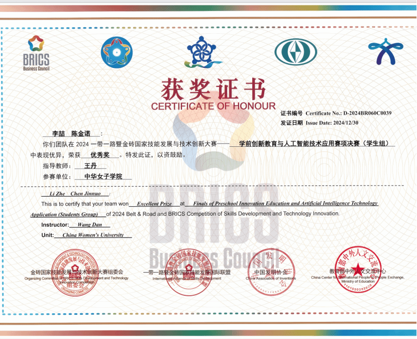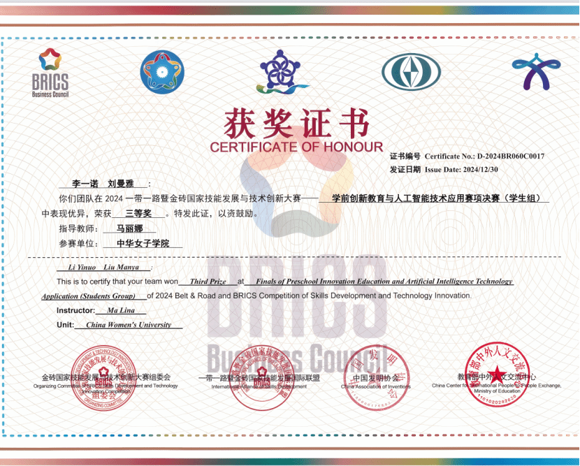 在激烈的角逐中,bwin必赢中国官网儿童发展与教育学院的师生团队凭借扎实的专业知识、出色的实践能力和创新精神,取得了优异成绩。学生组中,在王丹和马丽娜老师的精心指导下,李一诺、刘曼雅团队荣获三等奖,李喆、陈金诺团队荣获优秀奖;教师组中,郭国燕、杨雨欣团队表现突出,荣获二等奖。同时,bwin必赢中国官网因在大赛组织工作中的卓越表现,被授予突出贡献奖和教师组优秀组织奖。这些奖项不仅是对参赛师生个人能力的高度认可,更是对bwin必赢中国官网在学前创新教育与人工智能技术应用领域教学成果的充分肯定。