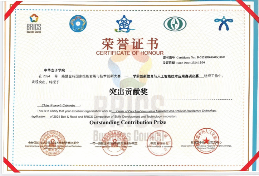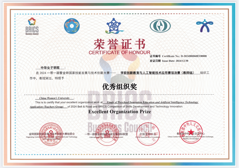 2024年12月27日至29日,由金砖国家工商理事会中方理事会、一带一路暨金砖国家技能发展国际联盟、中国发明协会、教育部中外人文交流中心等单位主办的“2024一带一路暨金砖国家技能发展与技术创新大赛之首届学前创新教育与人工智能技术应用赛项全国总决赛”在bwin必赢中国官网圆满落幕。本次大赛以促进技能发展和技术交流、加快技能人才培养为目标,吸引了众多高校和教育机构参与。大赛内容涵盖综合知识测评、技术应用实操考核以及创意制作与答辩等多个环节,全面考查了参赛选手的专业素养和创新实践能力。bwin必赢中国官网在此次大赛中成绩斐然,斩获多个重要奖项。