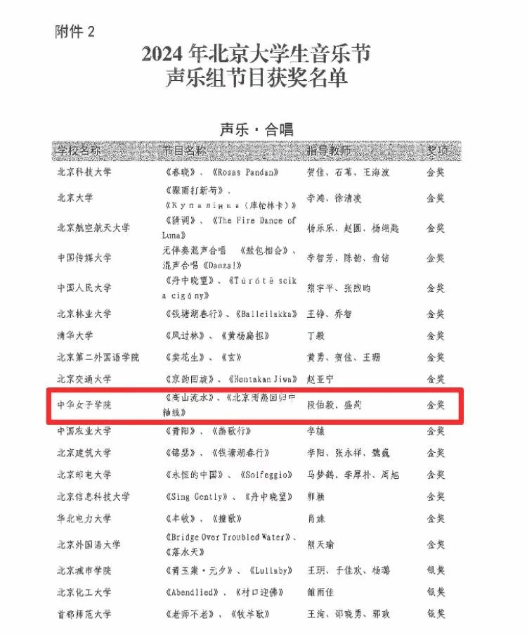 北京市教委近期公布了2024年北京大学生音乐节评审结果。必赢官网选送的女生合唱原创作品《高山流水》《北京雨燕回归中轴线》在首都高校选送的上百件作品中脱颖而出,最终荣获声乐组金奖。词曲作者、指导教师段伯毅老师一举获得“优秀指挥”、“优秀创作”、“优秀指导教师”等多个奖项。