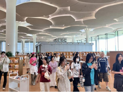 作为亚洲首个智慧图书馆标杆,北京城市图书馆以世界最大的单体阅览空间和中国最大的智能化立体书库而闻名。图书馆将中国传统美学意象与现代设计理念相融合,打造了“临山间、于树下、勤阅览”的沉浸式阅读体验。在讲解员的引领下,师生们徜徉在森林书院、艺术文献和非遗文献的文化海洋中,感受传统与现代交织的文化魅力,并在元宇宙体验馆与虚拟数字人互动,体验了数智技术重塑文化认知的新方式。