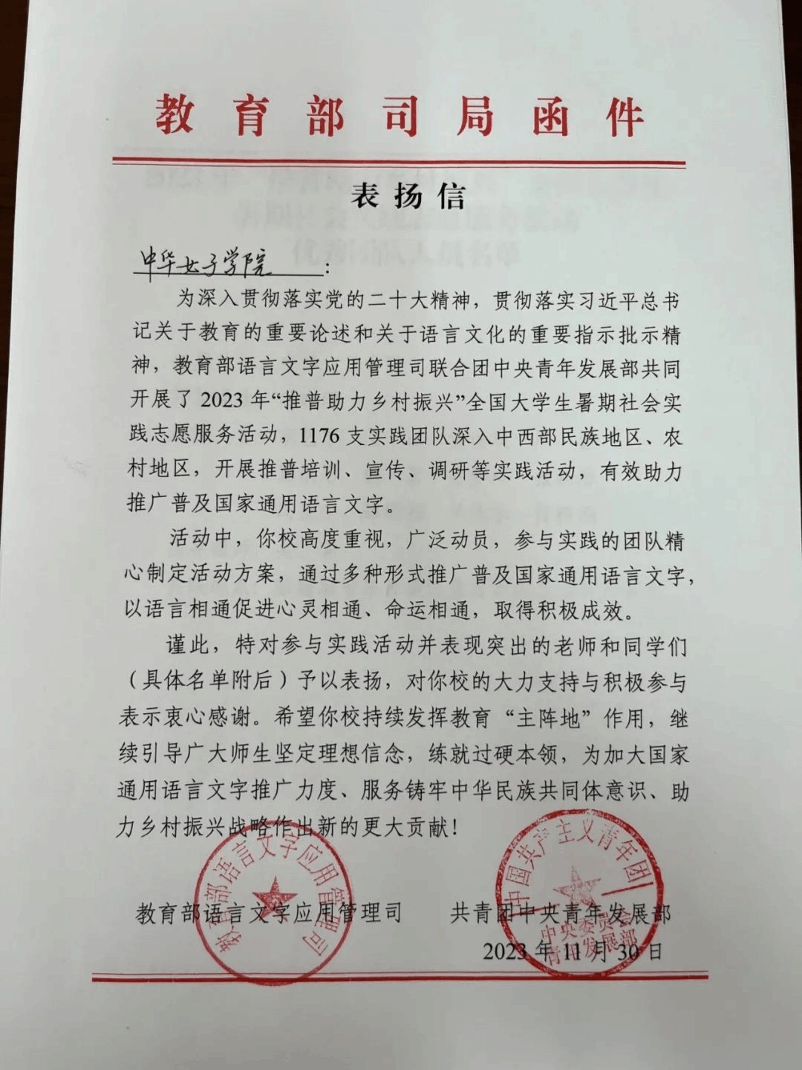 近日,教育部语言文字应用管理司、共青团中央青年发展部联合向必赢官网发来表扬信,对必赢官网石榴籽“悦”读推普团在2023年“推普助力乡村振兴”全国大学生暑期社会实践志愿服务活动中的突出表现给予了高度的评价。2023年“推普助力乡村振兴”全国大学生暑期社会实践志愿服务活动共有来自全国1056所高校的4123支团队报名参加,1176支团队入选,仅240支队伍被评选为“优秀团队”,由校团委支持、图书馆指导下成立的研读学社发起的石榴籽“悦”读推普团荣列其中。