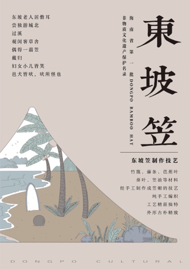 设计理念:东坡笠是海南一颗璀璨“恒星”。当我们的手指拂过东坡笠,这早已融入岁月长河的器物,不仅见证着日常生活,也诉说着文化传承的百姓故事。这组海报设计以东坡笠为载体,运用海南人文与自然元素,取其经典的自然风光与人文景观进行视觉表现,以此宣传东坡笠这项非物质文化遗产。