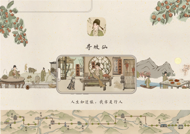 设计理念:《寻坡仙APP》围绕苏东坡的生平、诗词、书画、成就和人际关系五个方面展开交互游戏创作,使用户在交互中认识苏轼,了解他的人生意义、作品成就、思想价值以及在文学艺术史上的地位和影响。同时以人生路线图的方式展现了苏轼一生足迹踏过的地理风貌,以促进相关地区的文化旅游业发展。该作品希望用户能够体会和领悟东坡精神及人格魅力,即超然的审美、洒脱的人生、智慧的观照、实干的精神、亲和的人性等。