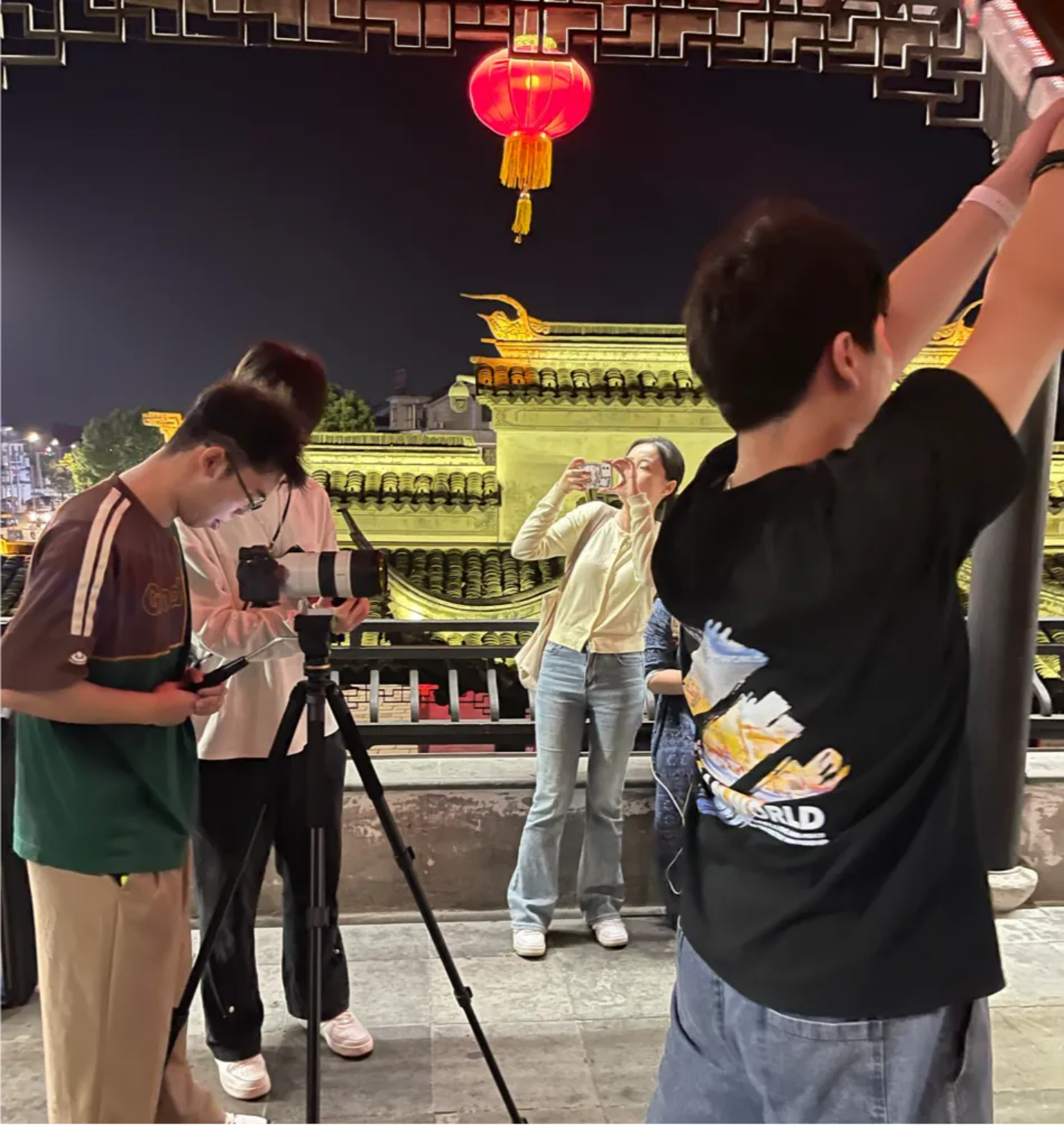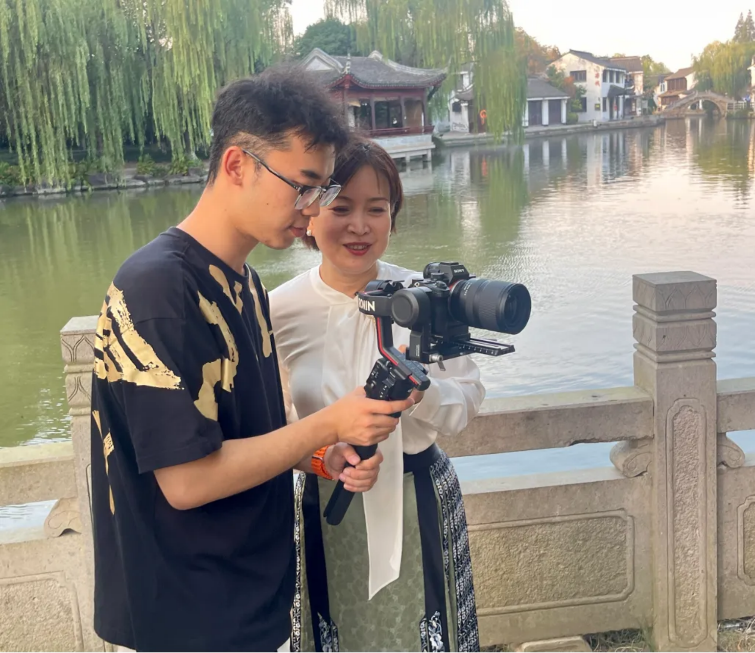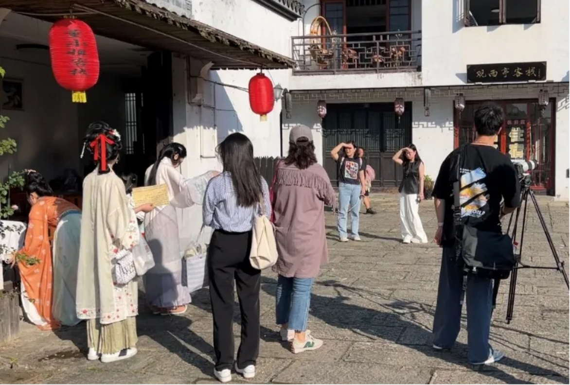 11月2日下午,老师和同学们抵达西塘古镇,随即按照计划紧锣密鼓地开展实践活动。带队老师与摄制小组走进古镇,提前采点、拍摄空镜、设计拍摄场景;负责服装造型指导的老师根据诵读的诗词、相应历史时期的服饰风格为学生调整造型、搭配服饰。
