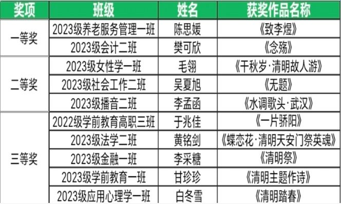 本次活动,不仅激发了同学们对诗歌创作的兴趣,提高了文化素养,增进同学们对清明节文化内涵的理解,推动校园文化的繁荣发展,同时还通过诗歌感悟革命先烈展现出来的忠诚、执着、朴实的鲜明品格以及崇高的民族精神和时代精神,更加坚定了同学们听党话、跟党走的决心,激发了为实现中华民族伟大复兴而不懈努力的昂扬斗志。