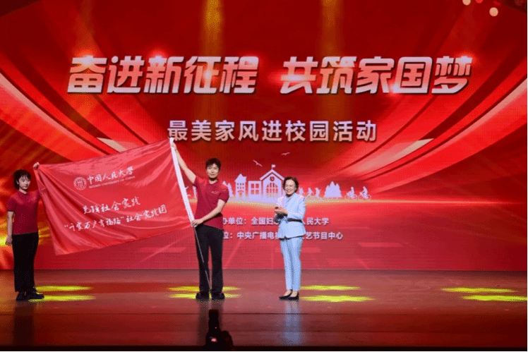 10月24日,由全国妇联主办的“奋进新征程 共筑家国梦”最美家风进校园活动在京举办。国务委员、全国妇联主席谌贻琴对深化寻找“最美家庭”活动、推进最美家风进校园,引领广大青年厚植家国情怀,为强国建设、民族复兴伟业贡献青春力量提出明确要求。活动现场,全国妇联党组书记、副主席、书记处第一书记黄晓薇为中国人民大学成立“千家万户幸福路”学生社会实践团授旗,勉励青年学子胸怀家国天下、弘扬时代新风,把青春之歌写在中国大地上。