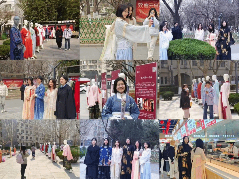 服装区既有婉约之美的宋服,也有明艳动人的唐装,还有那绿肥红瘦的旗袍等服饰。身着不同朝代服饰的学生们穿梭于校园的角角落落,与温煦阳光下的景致相映成趣,让羽衣翩然起舞,衣香缕缕入春意,蝶在花头谁争俏,共赴千年这美旅!