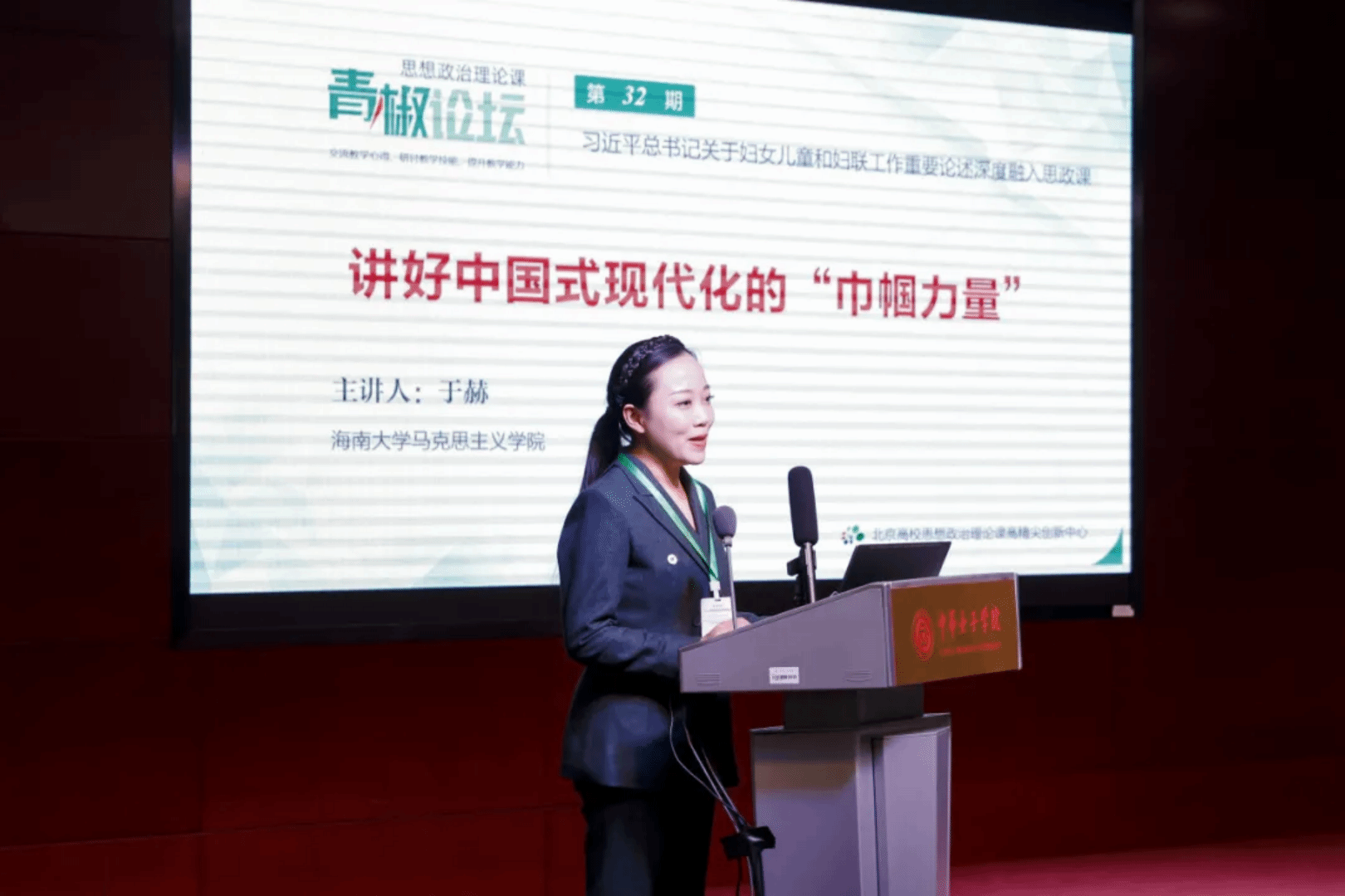 第六届全国高校青年教师教学竞赛思政课组一等奖获得者、海南大学马克思主义学院于赫副教授以“中国式现代化中的巾帼力量”为题,对习近平总书记关于妇女儿童和妇联工作重要论述深度融入“习近平新时代中国特色社会主义思想概论”课教学提出了思考。