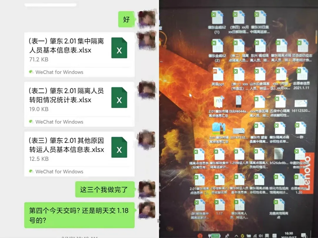 1月10号我的黑色土地家乡黑龙江省望奎县,爆发了疫情,家家户户门口贴封条,马路上买年货的小摊也没有了。我被隔离在几百公里外的哈尔滨,看到家里的情况,非常痛心。我想马上回去,就在此刻回去,去帮助居民、去一线,我不能坐视不理,那是我的家乡。但是我没有成功,团委工作人员说:“望奎情况十分严峻,道路全封,我很理解你想贡献力量的心情,但是真的回不来了。” “那我,能做些线上工作吗?哪怕是最微不足道的小事,我也想做,我可以做一个‘工具人’只要能帮得上忙”,我在电话另一端急切的说道。“那你帮我们整理一下表格吧,统计一下志愿者和隔离人员信息”。“好的”,我答应了。