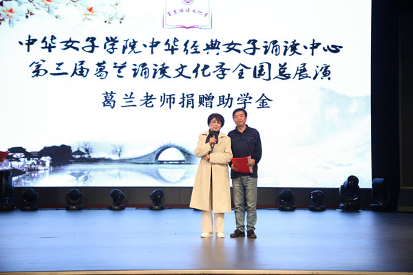 在“我与诵读”展演环节,来自山西长治的毛行云老师在舞台上接受了主持人采访,为我们讲述了他是如何被葛老艺术吸引,在葛老精神的感召下,到山区去推广和普及经典诵读的动人故事。随后,葛兰老师为来自山区的32名小选手颁发了“葛兰助学金”,把展演活动推向了高潮。