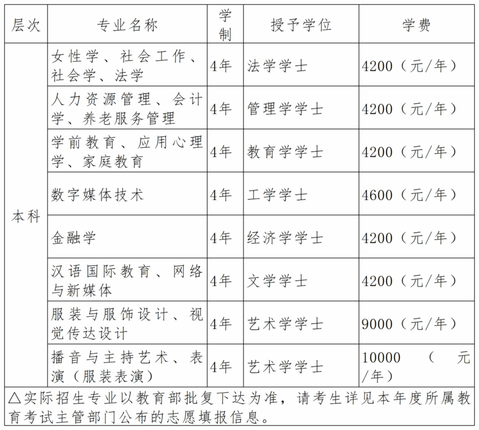 学校本科播音与主持艺术专业男女兼招,不设性别比例限制,其余各专业只招收女生。