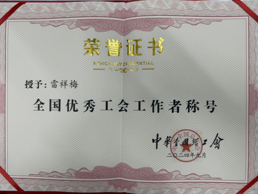 近日,必赢官网工会(妇委会)雷祥梅同志被中华全国总工会授予“全国优秀工会工作者”光荣称号。
