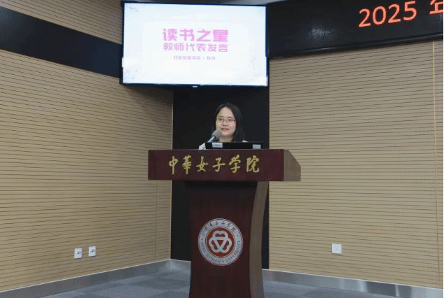 颁奖结束后,教师读书之星代表,来自妇女发展学院的林烨老师以“阅读智能时代守护独立思考的灯塔”为主题作了发言。她指出,人工智能时代要警惕思维同质化,鼓励师生进行深度阅读,不断锤炼逻辑、激发创新。同时,她分享阅读打卡、组建读书小组等方法,呼吁师生善用图书馆资源,以阅读为舟,驶向独立思考的知识海洋。