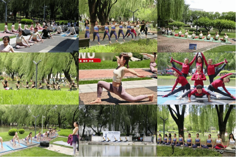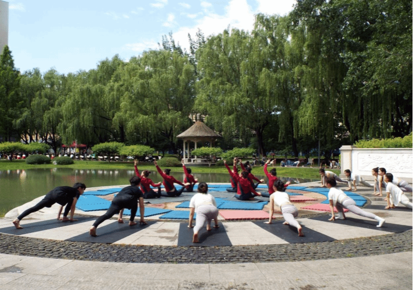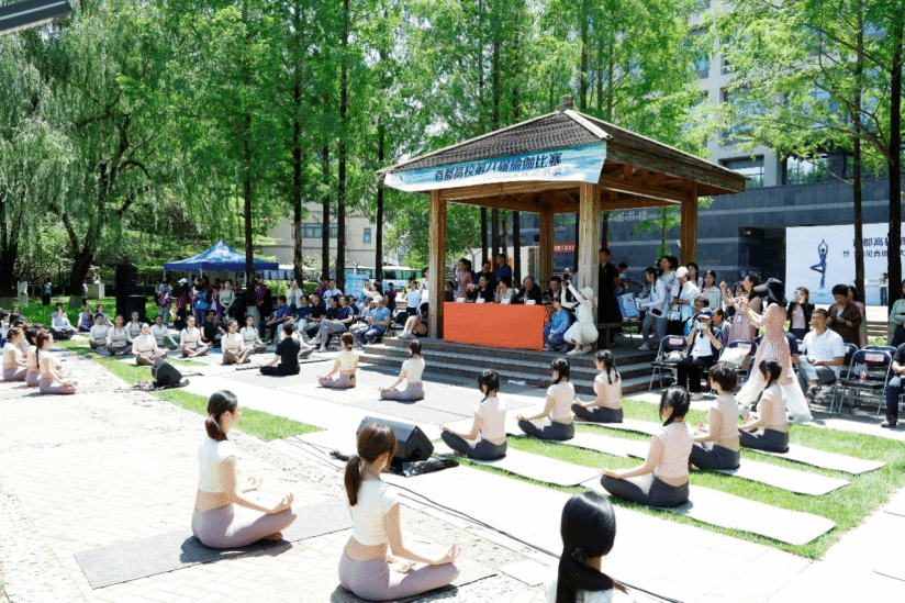 来自首都18所高校的100余名学生环绕育慧湖共同展示了瑜伽集体一级表演。