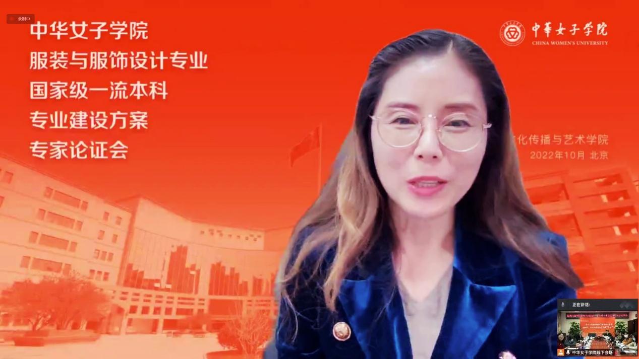 文化传播与艺术学院院长王露教授作为专业负责人,首先介绍了一流专业建设的主要思路,从专业定位及特色、人才培养模式改革、一流课程与特色教材建设、一流实践教学平台、教师队伍建设、教学改革和科研项目等六个方面全面介绍一流专业建设内容和路径,凝练出一个强化,二个体系,三个核心的服装与服饰设计专业特色与发展方向。