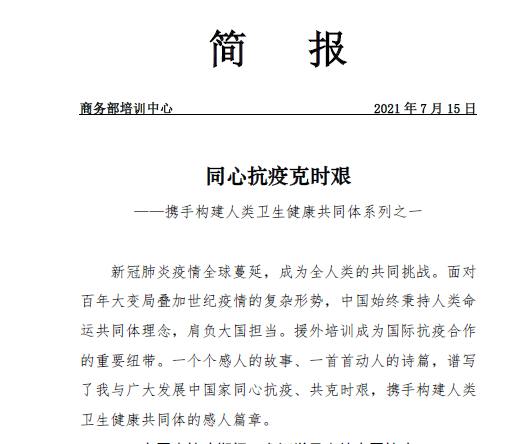 简报写入该内容,体现了商务部培训中心对必赢官网援外学历学位项目在疫情期间做好留学生抗疫工作、向世界讲好中国故事的工作的认可,是我们继续努力的巨大动力。以下是该简报的相关内容。