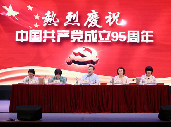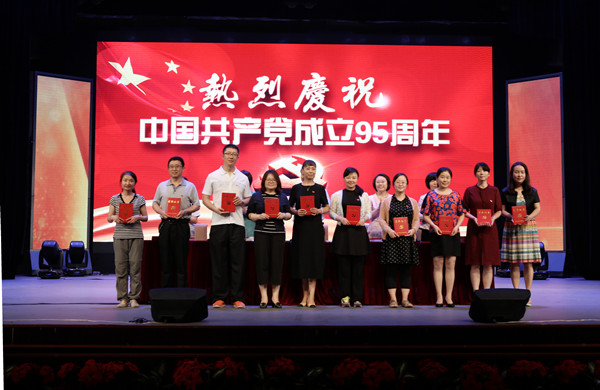 党徽闪闪,烁烁其华,在喜迎党的95年华诞之际,6月28日下午,学校在礼堂隆重召开“两学一做”学习教育暨庆祝建党95周年“七一”表彰大会。党委书记李明舜主持会议并讲话,党委副书记、院长刘利群,党委常委、副院长宋胜菊、王京霞,党委委员、副院长王练出席大会。全体在职党员、离退休党员代表、在校学生党员及入党积极分子参加大会。
