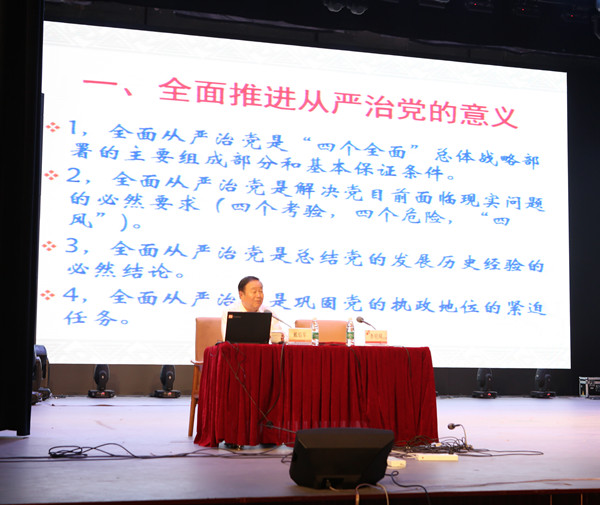中共中央党校戴焰军教授为全体党员作了题为“推进全面从严治党——学习习近平执政党建设讲话精神”的辅导报告,从推进全面从严治党的意义、从严治党的重点任务、推进全面从严治党的根本途径等三个方面深入解读了习近平总书记关于执政党建设的系列重要讲话精神。
