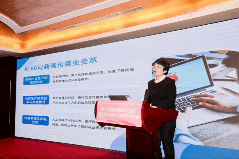 中国传媒大学媒介与女性研究中心副主任王琴从学术视角带来了对女性数字赋能现状与挑战的深刻分析。王琴副主任的发言中强调了女性在数字社会中的赋能路径、面临的挑战以及实现性别平等数字社会的必要性。她指出,数字技术为女性提供了获取知识、参与经济和实现自我发展的重要渠道,同时强调了数字社会中的性别偏见,技术的设计和应用往往偏向于男性主导。为有效应对性别数字鸿沟带来的挑战,她提出要构建性别平等的数字文化环境,全面推动数字素养教育,以实现女性在数字社会中的平等参与与发展,这些观点不仅全面论述了当前问题,也为女性在数字时代的全面参与提供了专业的学术视角和指导方向。