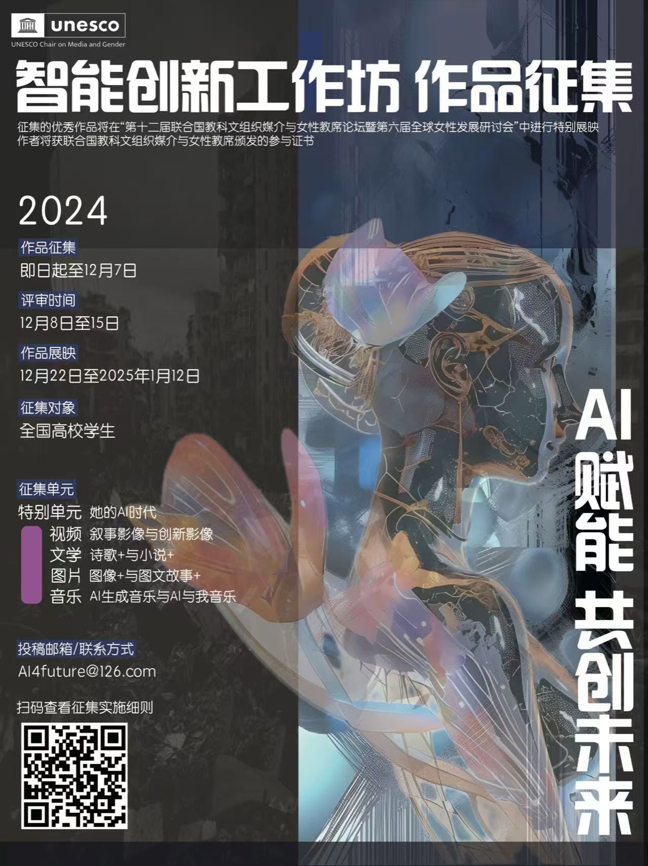 本次工作坊设置四个征集单元和一个特别单元,征集单元旨在探索AI技术与多元媒介创作实践,特别单元鼓励女性创作者在AI技术与艺术融合的探索中展示独特视角和创意风采。我们期望为参与者提供展示创意与技术的机会和平台,鼓励参与者在AI技术的助力之下,突破传统创作边界,开创全新的艺术表现形式。本次征集的优秀作品将在2024年12月21日至22日举办的“智能·平等·创新:数字赋能与全球女性发展第十二届联合国教科文组织媒介与女性教席论坛暨第六届全球女性发展研讨会”中进行特别展映,作者将获得联合国教科文组织媒介与女性教席颁发的参会证书。