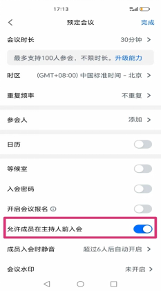 2. 腾讯会议或钉钉授课的课程,学生按照会议号进入课堂。注意:腾讯会议只有40分钟免费时长,到时间后,会议会自动结束,结束后,学生可以再次进入原会议号继续上课,少数课程第一节课和第二节课有两个不同的会议号,请按照实际情况进行操作,且腾讯会议有2人及以上进入时,即开始计时,请师生不要过早进入会议,同时教师可将会议设定为不允许成员在主持人前入会,具体操作参照下图,关闭按钮即可。