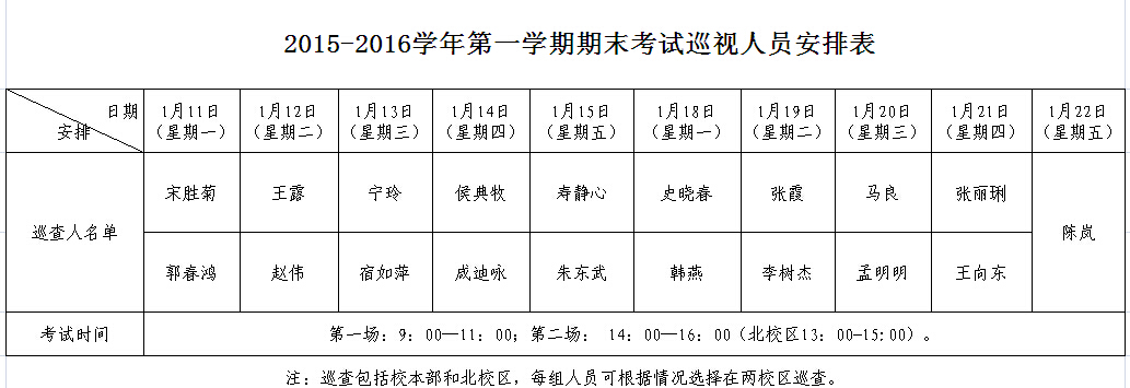 bwin必赢中国官网2015-2016学年第一学期期末考试校级巡查安排表