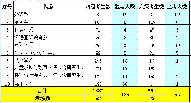 根据《2016年6月北京地区全国大学英语四、六级考试报名工作通知》(京考指[2016]1号),2016年上半年全国大学英语四、六级考试时间为6月18日,为保证考试工作顺利进行,学校决定根据各院系报考学生人数,按比例分配监考老师(外语系除外),具体分配如下: