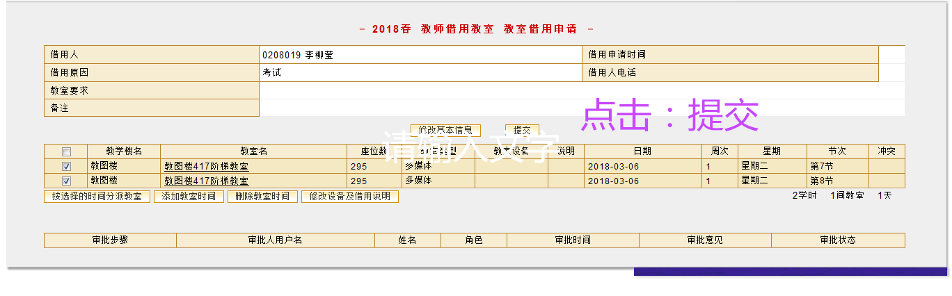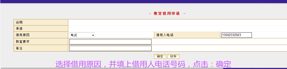 可选借用原因:上课、 百科知识讲座、考试、学生社团活动(禁止唱歌跳舞等影响其它教室上课的行为)、开会、院系讲座