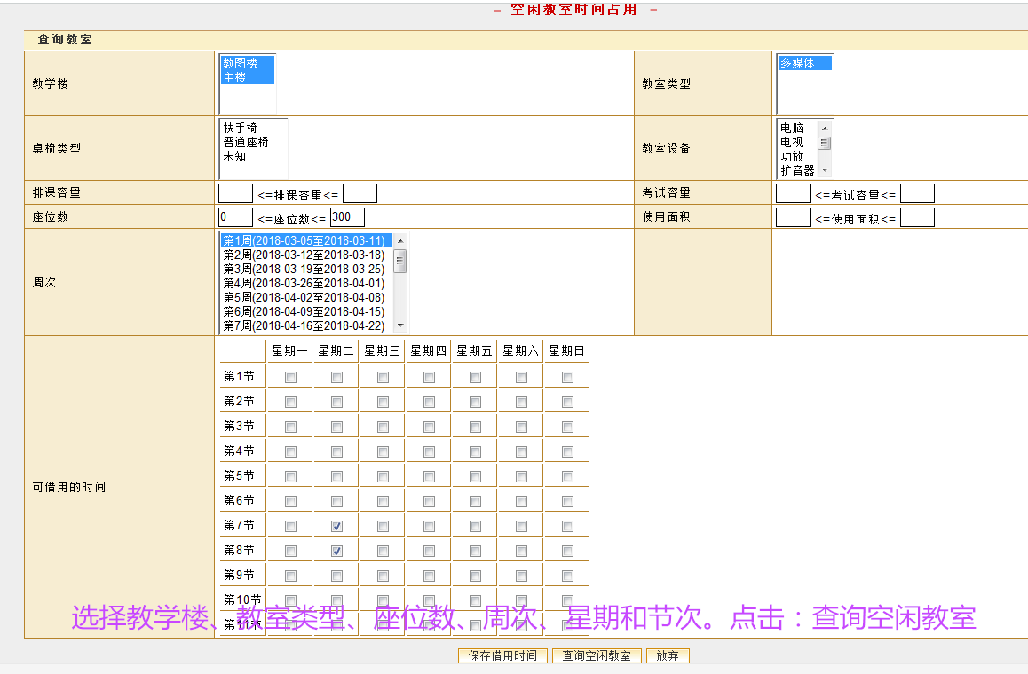 4、选择教学楼、教室类型、座位数、周次、星期和节次,点击:查询空闲教室