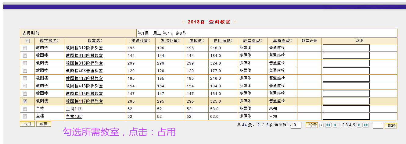 5、勾选所需教室,点击:占用