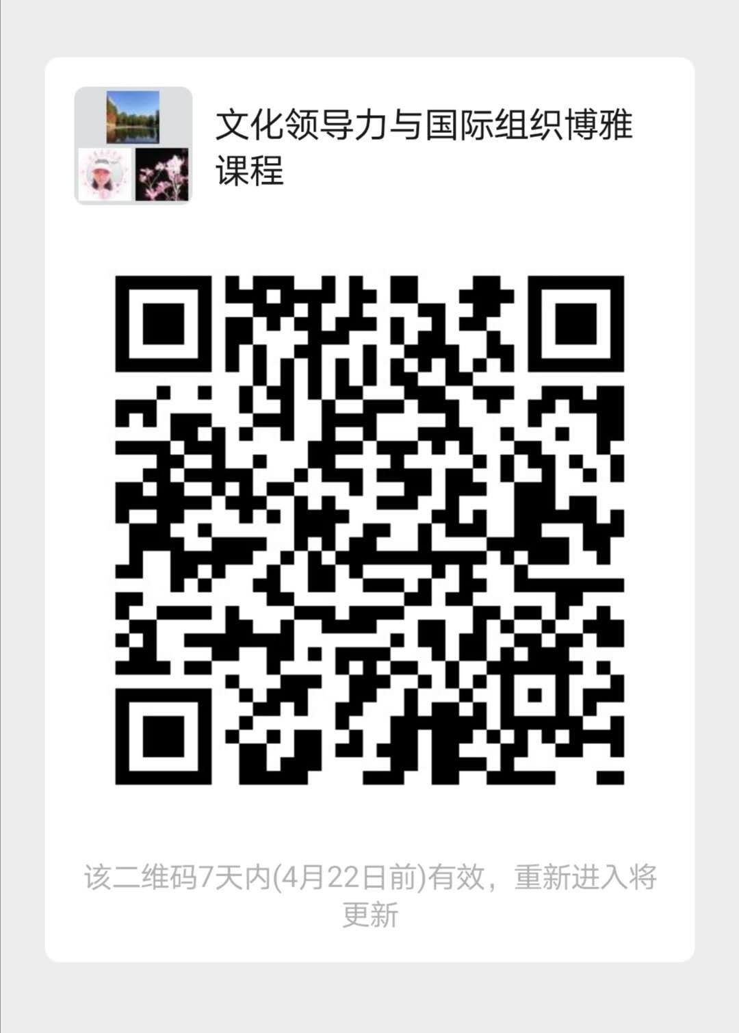 2020春季学期面授博雅课《文化领导力与国际组织》(孟晓驷等,周一,5-8节),将于4月20日(周一,5-8节)开始采用线上教学方式上课,请各位选课同学务必于4月20日前扫码进群并相互转告。