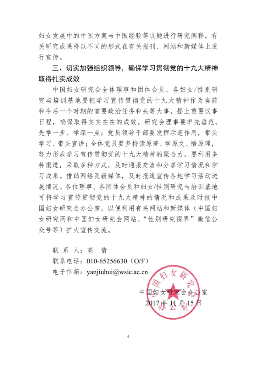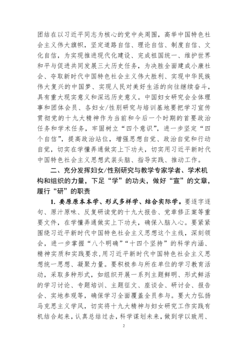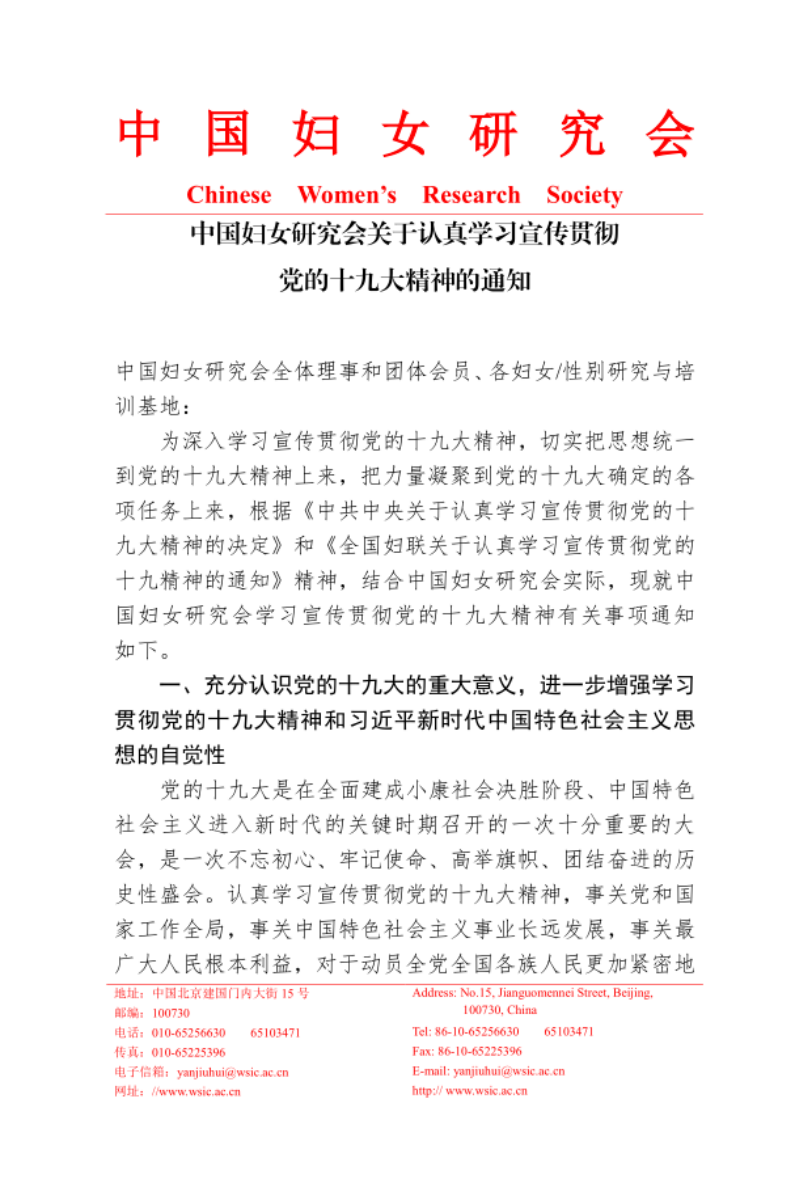 中国妇女研究会关于认真学习宣传贯彻党的十九大精神的通知