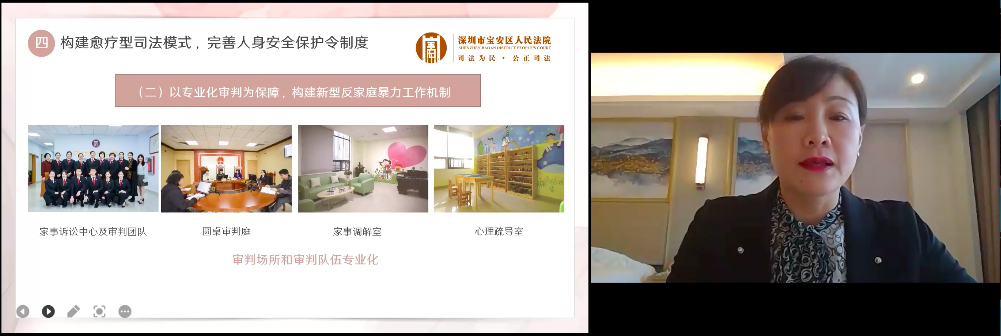 第一位发言专家、深圳市宝安区人民法院副院长张艳红法官以人身安全保护令的司法实践为视角,介绍了深圳宝安法院将愈疗型家事司法理念引入家庭暴力案件的司法审判程序和所在辖区社会综合治理的实践,提出了愈疗型的家事司法模式。
