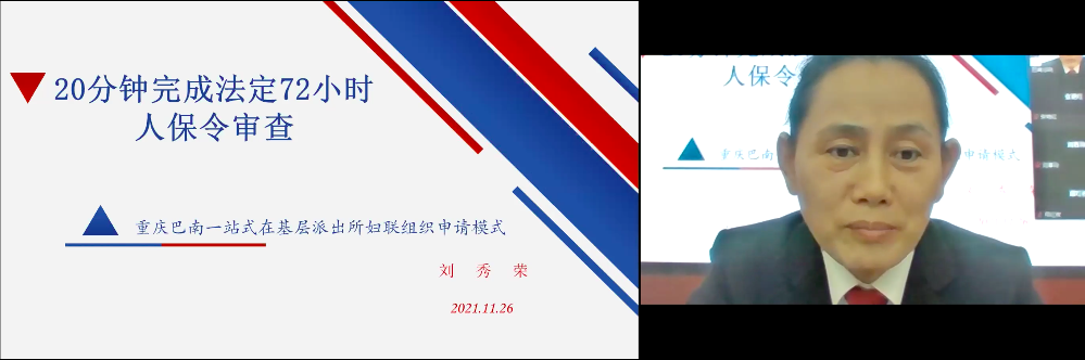 第二位中方专家、重庆市巴南区人民法院副院长刘秀荣法官首先指出了人身安全保护令在现实中存在的困境,之后介绍了重庆市巴南区一站式在基层派出所、妇联组织申请模式在应对这些困境时的有效做法,如申请工作前移、细化配套制度、工作流程线上平台快速对接等。