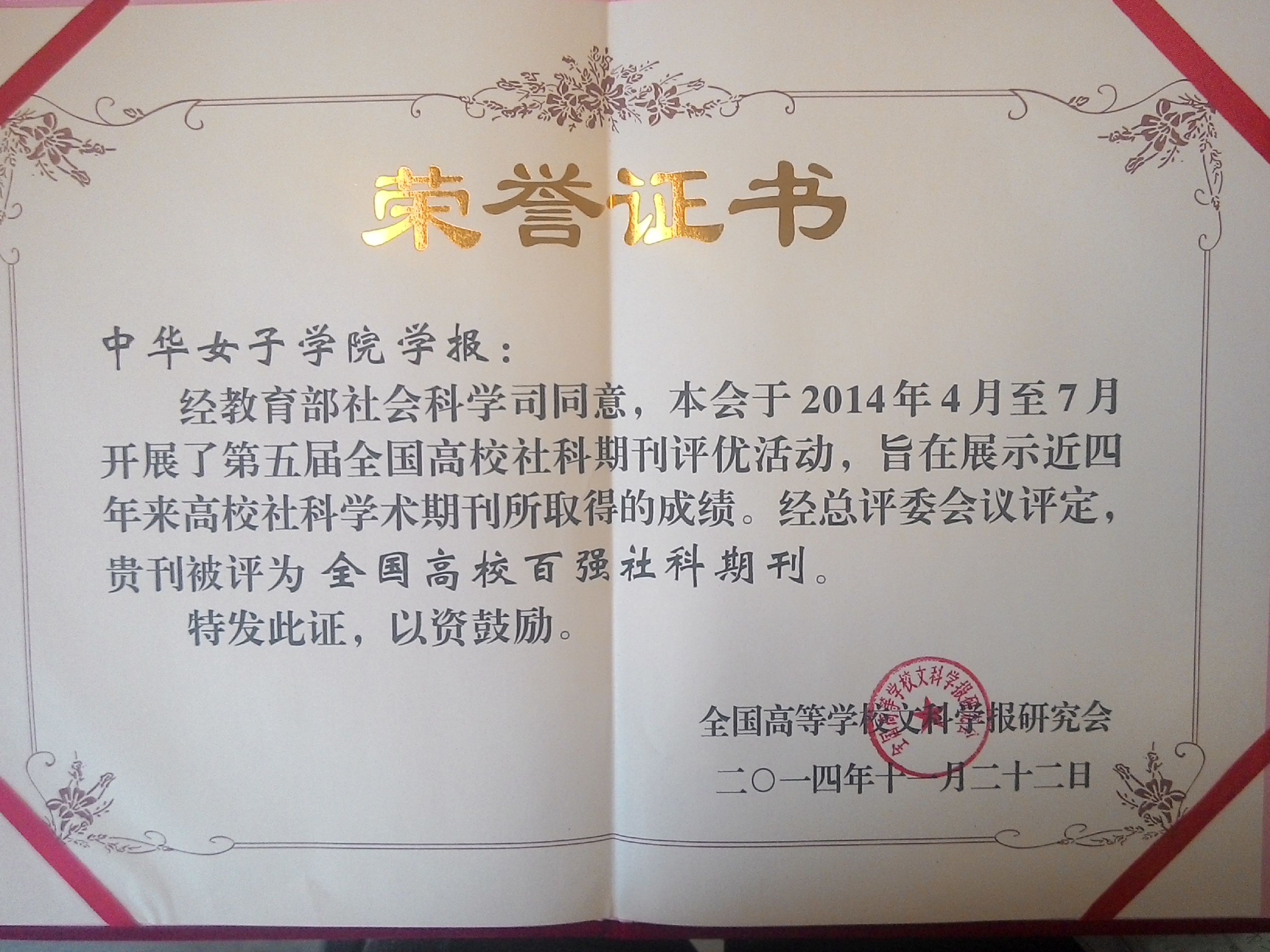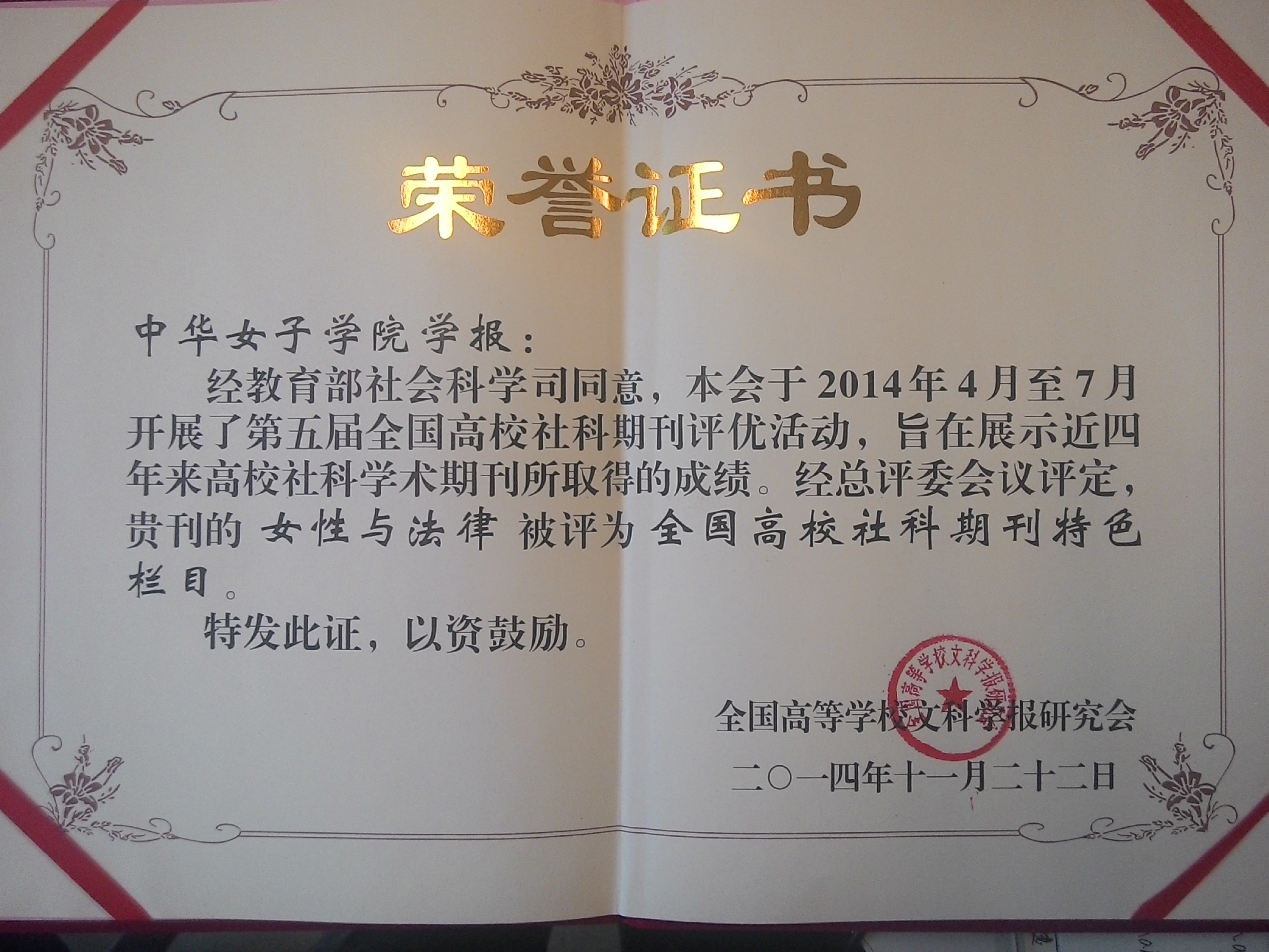 4月至7月,经教育部社会科学司同意,全国高等学校文科学报研究会开展了第五届全国高校社科期刊评优活动。全国高校社科期刊评优活动每四年举办一次,在业内具有广泛的影响力。本次评比共评出全国高校社科名刊31种、全国高校精品社科期刊79种、全国高校百强社科期刊107种、全国高校优秀社科期刊255种、全国高校社科期刊特别贡献奖1种、全国高校社科期刊特色栏目216个等。我刊2006年和2010年连续被评为“全国高校百强社科期刊”,这是第三次荣膺此称号。同时,“女性与法律”栏目被评为“全国高校社科期刊特色栏目”,这也是该栏目继今年年初入选教育部高校哲学社会科学学报名栏建设第三批名单后的又一重要奖项。
