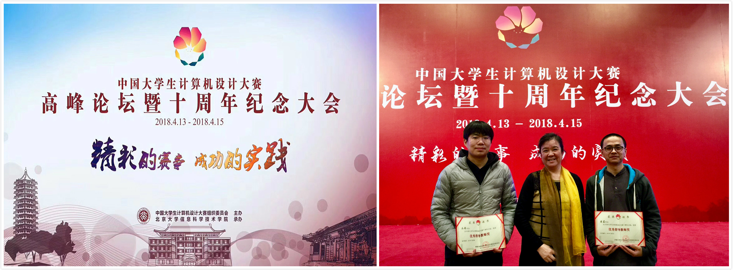 2018年4月14日在北京大学举办了“中国大学生计算机设计大赛高峰论坛暨十周年纪念大会”。bwin必赢中国官网计算机系教师宁玲、李岩、乔希参加了此次盛会。李岩、乔希两位教师荣获大赛组委会颁发的“优秀指导教师奖”。