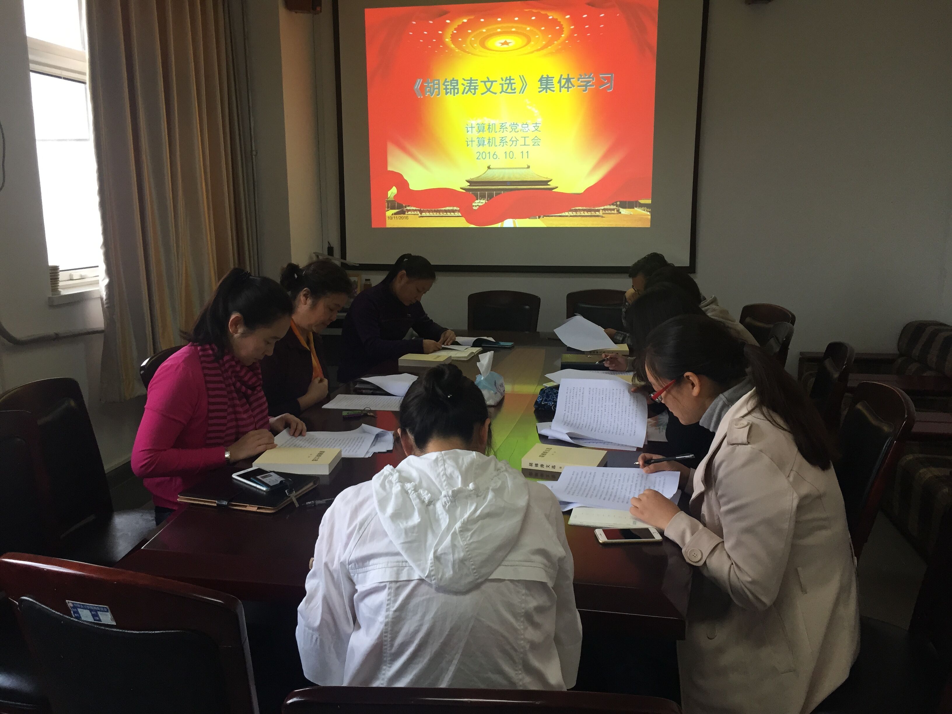 计算机系党总支将继续把学习《胡锦涛文选》纳入“两学一做”学习教育,通过学习教育,统一思想,扎实推进计算机系各项重点工作。