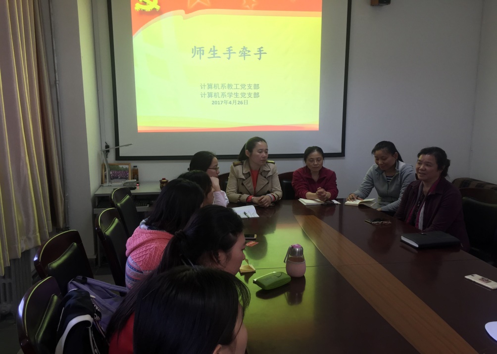 为深入贯彻党的十八大、十八届三中、四中、五中、六中全会和习近平总书记系列重要讲话精神,发挥党支部在工作中的战斗堡垒作用。4月26日在主楼538房间,计算机系教工党支部牵手计算机系2015级学生开展了“师生手牵手”活动。计算机系教工党支部委员、部门领导、教工党员代表和学生代表参加了活动。会议由计算机系教工党支部书记李丽莉主持。