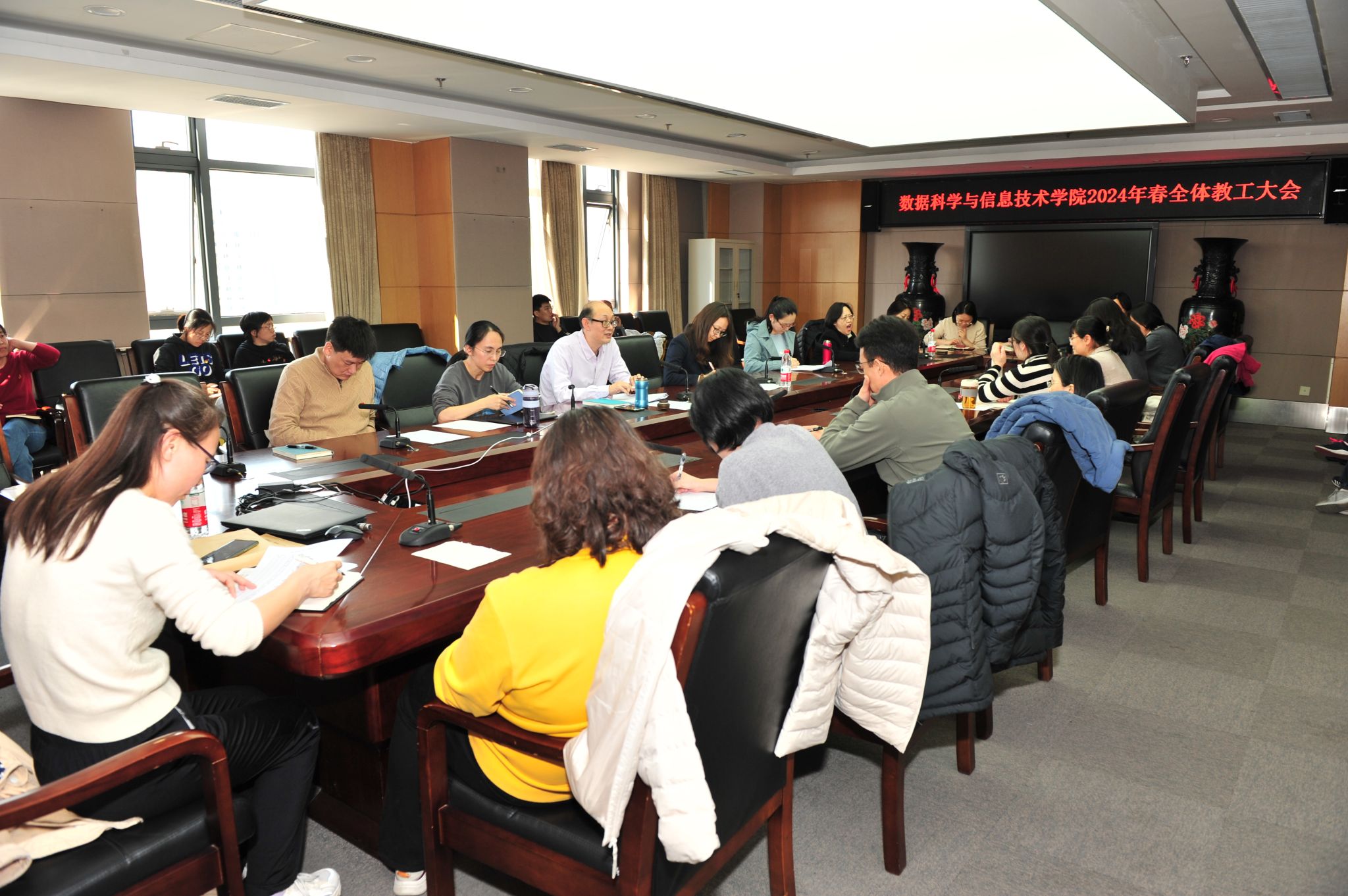 为第一时间学习领会"两会"精神,统一思想、提高认识、明确目标、落实举措,做好开篇布局、共谋建设发展,有序推进学院新学期教学科研工作开展,3月11日下午数据科学与信息技术学院召开新学期教学工作例会,学院领导班子成员及全体教职工参加会议。学院联系校领导李莹常委、副院长出席会议,与学院全体教职工进行座谈交流并于会后与学院领导班子成员进行谈话。